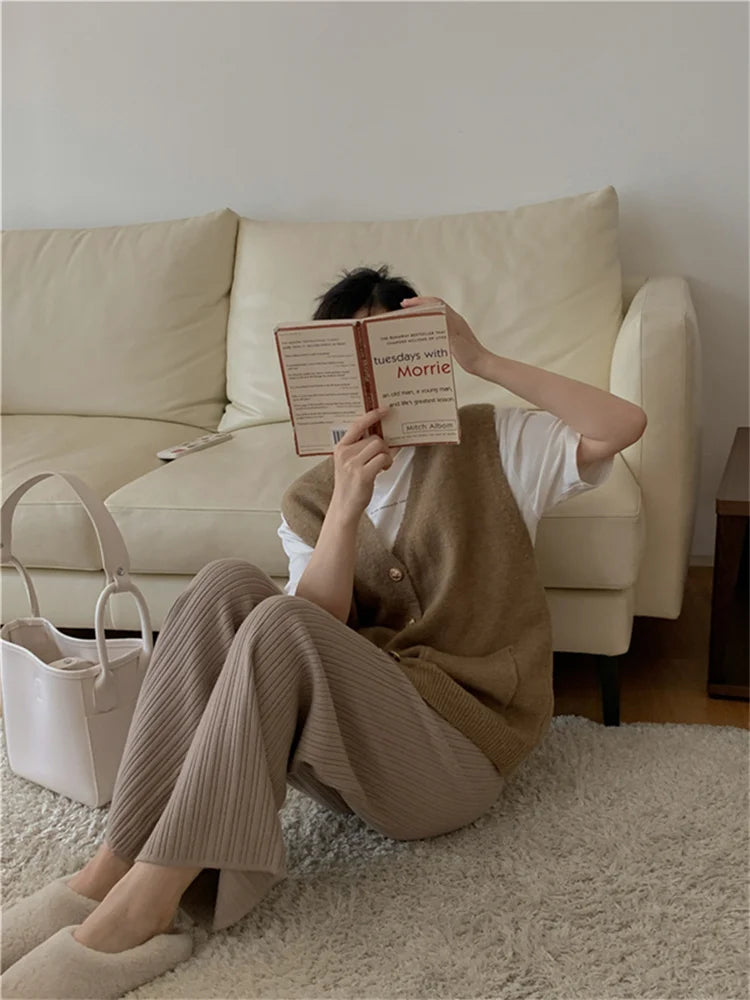Drawstring Ribbed Knitted Wide Leg Sweatpants